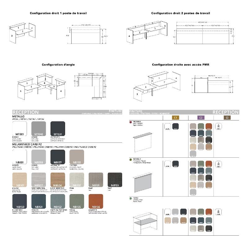 Chaque module présente une facade en un seul panneau et les dessus de travail sont assortis avec une finition Wengé, Hêtre, Chêne moyen, Poirier, Gris ou Blanc selon votre choix, harmonisé au piétement de type K3. - Domaine d'utilisation: - Réussissez le bureau banque d'accueil adapté aux