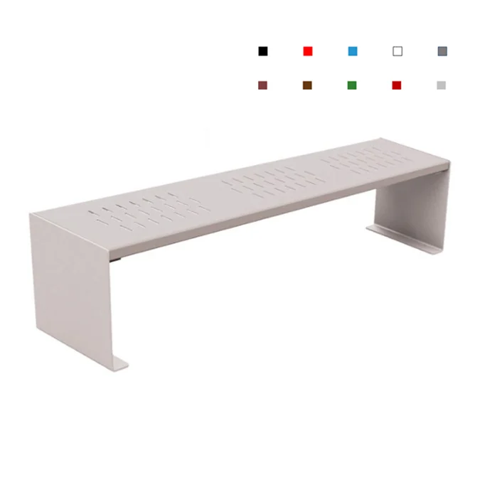 Banquette tout acier solide et sans entretien de l'assise. - . Structure: acier 450 x 450 mm épaisseur 3 mm peint sur zinc selon nos coloris (à préciser à la commande) - . Assise: Tôle peinte sur finition galvanisée selon coloris - . Longueur : 1800 mm - . Poids : 50 kg - . Fixation: su