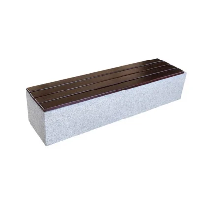 Banc en béton préfabriqué coloris gris granite d’aspect rugueux. - Lattes en bois tropical de dimensions 110 x 35 mm, traitées avec Lignus (protecteur fongicide, insecticide et hydrofuge). Finition : teinte naturelle. - Possibilité de placement : séparément ou en groupe. - Ancrage recomm