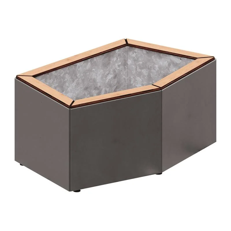 Les ensembles d'assises et bacs à palmiers modulables "Le Caire" s'inscrivent dans les tendances actuelles de nos villes. Les formes en pentagone qui font références à des pavages, permettent de jouer sur un nombre de combinaisons multiples, tout en mettant en scène des assises et des bacs à palmier pour allier l'esthétisme et le confort. Module Banquette . Longueur: 1065 mm . Hauteur d'assise: 465 mm . Structure: Tôle d'acier galvanisée thermolaqué selon nos coloris . Assise : En stratifié compact épaisseur 13 mm teinte chêne clair . Fixation: Sur pieds réglables jusqu'à 55 mm . Montage: Livré assemblé Module Bac à Palmiers . Dimensions: Largeur 665 x longueur 1065 x hauteur 465 mm . Habillage: Tôle d'acier galvanisée thermolaquée, rebords en stratifié compact . Finition intérieure: Revêtement en tôle galvanisé avec un film géotextile . Fixation: Sur pieds réglables jusqu'à 55 mm ( scellement possible par tiges non fournies) Et pour encore plus de confort ! �