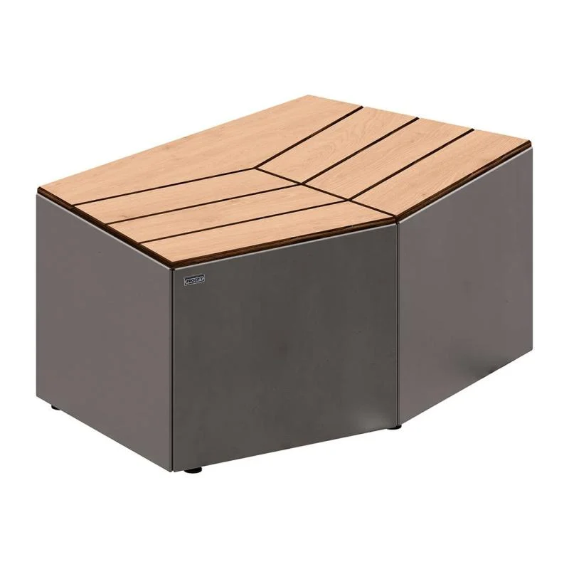 Les ensembles d'assises et bacs à palmiers modulables "Le Caire" s'inscrivent dans les tendances actuelles de nos villes. Les formes en pentagone qui font références à des pavages, permettent de jouer sur un nombre de combinaisons multiples, tout en mettant en scène des assises et des bacs à palmier pour allier l'esthétisme et le confort. Module Banquette . Longueur: 1065 mm . Hauteur d'assise: 465 mm . Structure: Tôle d'acier galvanisée thermolaqué selon nos coloris . Assise : En stratifié compact épaisseur 13 mm teinte chêne clair . Fixation: Sur pieds réglables jusqu'à 55 mm . Montage: Livré assemblé Module Bac à Palmiers . Dimensions: Largeur 665 x longueur 1065 x hauteur 465 mm . Habillage: Tôle d'acier galvanisée thermolaquée, rebords en stratifié compact . Finition intérieure: Revêtement en tôle galvanisé avec un film géotextile . Fixation: Sur pieds réglables jusqu'à 55 mm ( scellement possible par tiges non fournies) Et pour encore plus de confort ! �