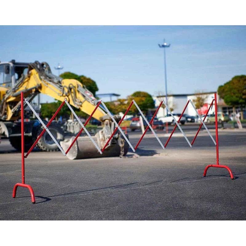 La barrière extensible en acier, réalisée en rouge et blanc, est idéale pour les travaux publics grâce à la bichromie qui a le mérite d'être visible de loin et sous tout éclairage. Simple à poser, sans fioriture et stable