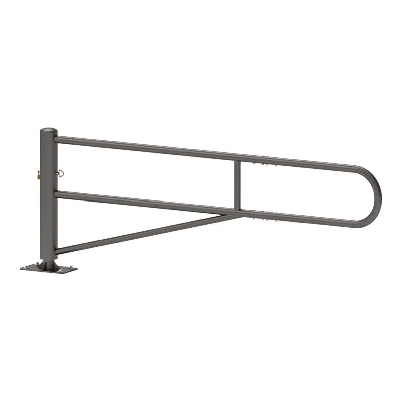 BARRIÈRE TOURNANTE TROMBONE - Tube acier : 60 mm - Pivot : Assuré dans un tube extérieur - Longueur : 1800 mm - Fermeture standard : Goupille d16 mm et cadenas fournis - Blocage possible : À 90° en position ouverte - Finition : Galvanisée ou peinte - Fixation : Sur platines avec gousset
