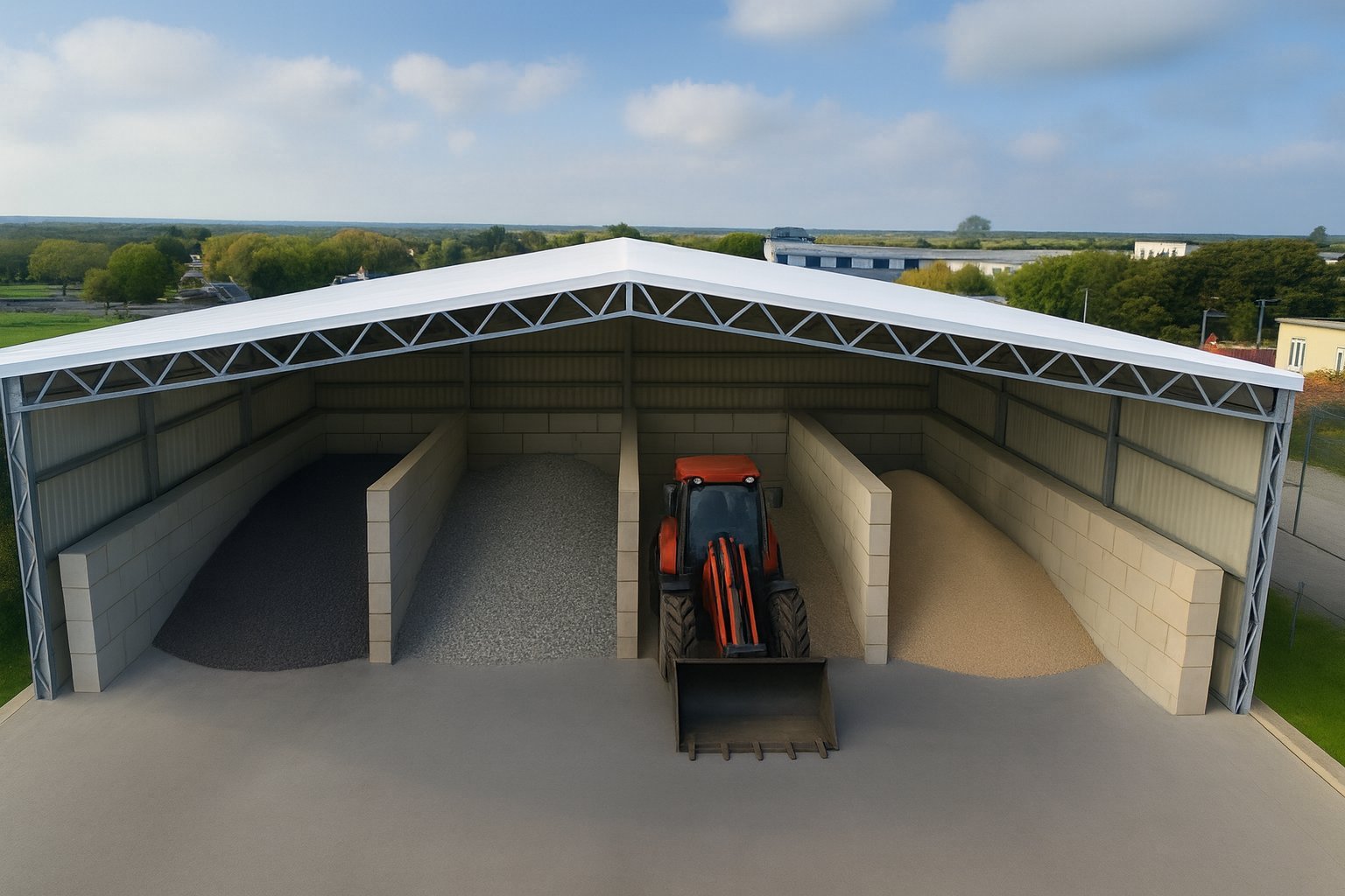 Structure modulable dédiée au stockage de vrac : céréales, bois - énergie, granulés, plaquettes forestières, sable, gravier, matériaux de construction. - Adaptée aux environnements agricoles et industriels. - Montage rapide, résistance élevée, volumes sur mesure.Ce hangar spécialement