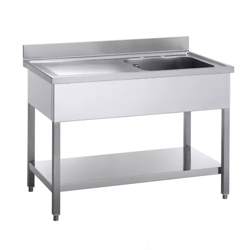Bacs de plonge et égouttoir en inox (AISI304) - Piètement en inox (AISI201) - Égouttoir à droite - 1 bac de plonge - Plonge insonorisée avec bords anti - ruissellement - Égoutoir nervuré - Dosseret plat (100 x 20 mm) - Pieds carrés avec vérins ajustables sur 30 mm - Bonde et tube d
