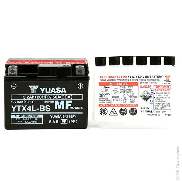 Batterie moto YTX4L - BS YUASA de type "AGM sans entretien". Le pack acide est inclus dans le packaging de la batterie. Capacité en C10 : 3Ah Puissance au démarrage (CCA) : 50A Modèle de cosses : 5 Polarité : Borne négative à gauche - La batterie YTX4L - BS VRLA (plomb - acide à rég