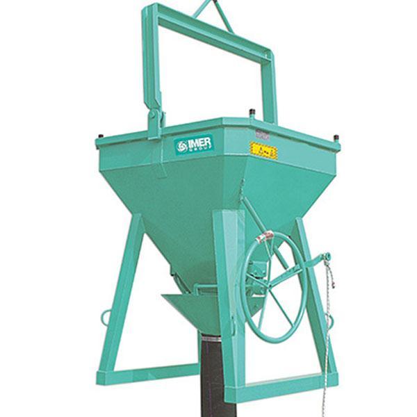 Benne droite 1500 litres à volant BCE - 150V . Applications : Grâce à la démultiplication du volant, vous disposez d'une grande précision d'ouverture et de fermeture. Ce mécanisme associé au cône de récupération des laitances sur - dimensionné permet d'utiliser les bétons liquides et aut