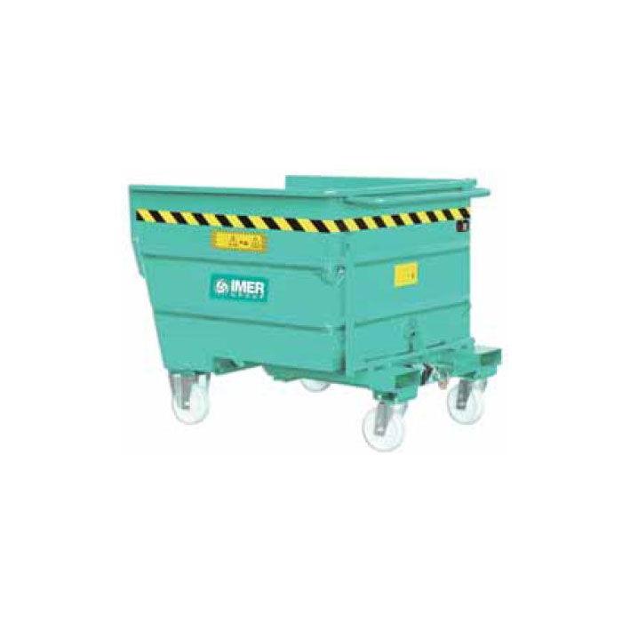 Benne renversable avec roues IMER. Capacité maxi: 500 litres 1000 kg A: 1 400 mm B: 980 mm C: 925 mm D: 845mm E: 680 mm Poids: 135 kg