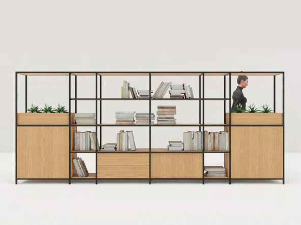 Bibliothèque de séparation en métal noir et bois mélaminé chêne naturel