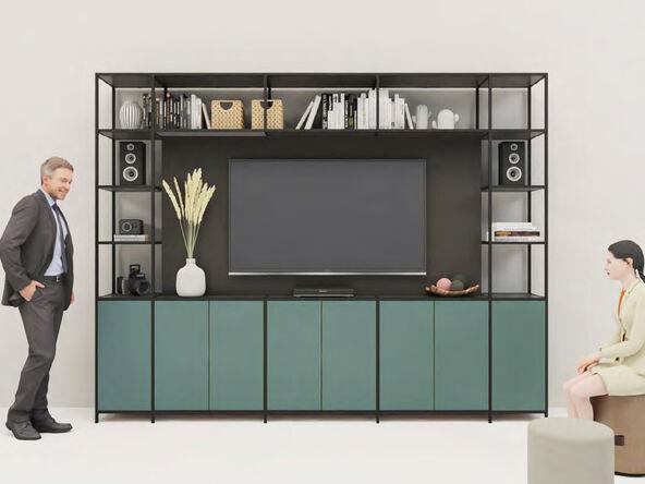 Bibliothèque Myst X5 avec structure en acier et rangements en laqué mat