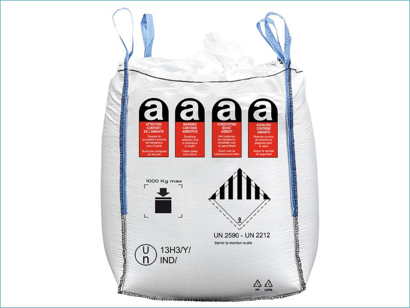 Big Bag 1T pour le transport et le stockage d'amiante. - Sache PE interne cousue - Marqué Amiante - Dimensions : 90x90x115cm - Certification : 13H3 Y - UN 2590 - 2212 - Conçu pour le stockage temporaire des sacs contenant des déchets d'amiante.Marque :DiversQuantité :0.00Frais de port :12