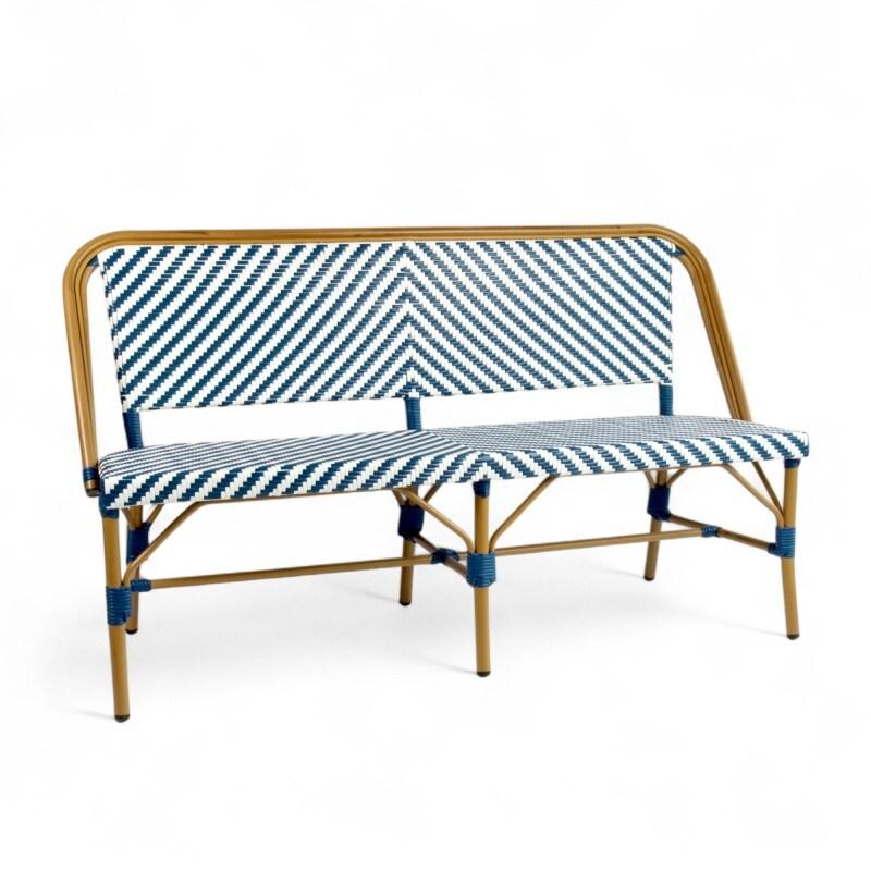 La banquette de terrasse parisienne au tressage graphique, sans accoudoirs !. La banquette de terrasse RIVOLI - tressage bleu et blanc offre un design à la fois rétro et tendance. Elément essentiel du mobilier de terrasse de restaurant, cette banquette de terrasse style bistrot présente un tressage travaillé en forme de vagues ou de chevrons bleus et blancs. Cette banquette de terrasse (sans accoudoirs) tressée aura un réel impact visuel en terrasse. Particulièrement bien fini, le tressage vient habiller aussi bien le dossier que l'assise. Cette banquette de terrasse de restaurant est très résistante grâce à sa structure en aluminium couleur rotin naturel et son tressage en polyéthylène. Ces deux matériaux permettent un usage extérieur même sans abri, et sont faciles d'entretien. Nos banquettes tressées répondent au cahier des charges de l'équipement et du mobilier CHR. Enfin, cette banquette de terrasse est légère et empilable. Nos banquettes extérieures sont également prévues pour un usage particulier. Elles peuvent être utilisées comme banquettes de jardin ou banquettes de balcon.. . . Caractéristiques techniques. . Banquette de terrasse bleue et blanche, tressage motif chevrons ou vagues. Structure entièrement en aluminium couleur rotin. Diamètre tube en aluminium : 28 mm. Épaisseur du tube en aluminium : 1,5 mm. Assise, dossier : tressage en polyéthylène imitation rotin. L 150 x P 60 x H 87 cm - H assise 45 cm. Banquette outdoor empilable. Livrée montée. Poids : 10 kg. . . . Comment entretenir sa banquette de bistrot ?. Toutes nos banquettes de terrasse en aluminium sont dédiées à un usage extérieur et professionnel. Résistantes à l'eau et aux UV, nos banquettes parisiennes ne demandent aucun entretien particulier et ne subissent pas la corrosion. Nettoyer l'aluminium à l'eau tiède et savonneuse à l'aide d'un chiffon doux puis sécher aussitôt.