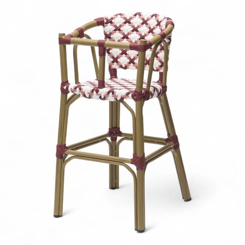 La chaise bébé au style parisien, au tressage haute - couture !. La chaise haute bébé ALMA reprend tout le style de la chaise de café parisien. Cette chaise extérieure, avec son tressage sophistiqué blanc et rouge, s'habille aux couleurs de l'été. Cette chaise de terrasse professionnelle es