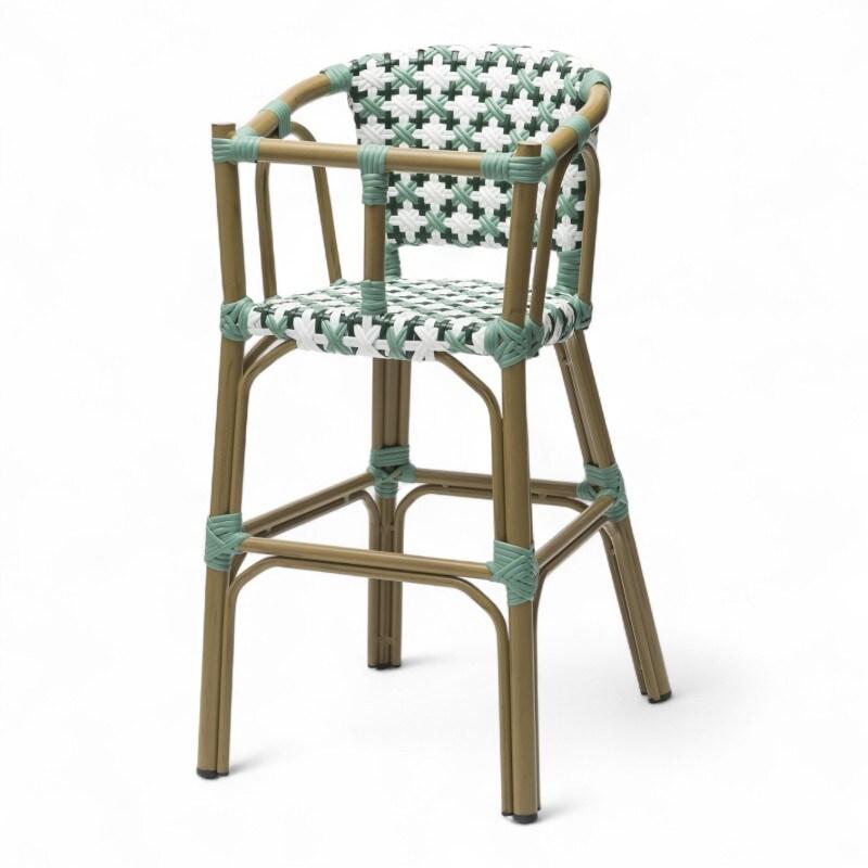 La chaise de restaurant haute pour bébé ST GERMAIN reprend tout le style de la chaise de café parisien. Cette chaise extérieure, avec son tressage sophistiqué vert et blanc, s'habille aux couleurs de l'été. Cette chaise de terrasse professionnelle est très résistante grâce à sa structure en aluminium couleur rotin naturel et son tressage en polyéthylène. Ces deux matériaux sont prévus pour un usage extérieur intensif et sont faciles d'entretien. Enfin, cette chaise de terrasse est légère et empilable. Nos chaises extérieures sont également prévues pour un usage particulier. Elles peuvent être utilisées comme chaises de jardin ou de balcon.