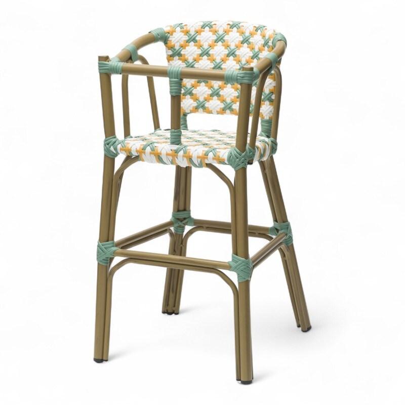 La chaise de restaurant haute pour bébé ST GERMAIN reprend tout le style de la chaise de café parisien. Cette chaise extérieure, avec son tressage sophistiqué vert jaune et blanc, s'habille aux couleurs de l'été. Cette chaise de terrasse professionnelle est très résistante grâce à sa structure en aluminium couleur rotin naturel et son tressage en polyéthylène. Ces deux matériaux sont prévus pour un usage extérieur intensif et sont faciles d'entretien. Enfin, cette chaise de terrasse est légère et empilable. Nos chaises extérieures sont également prévues pour un usage particulier. Elles peuvent être utilisées comme chaises de jardin ou de balcon.