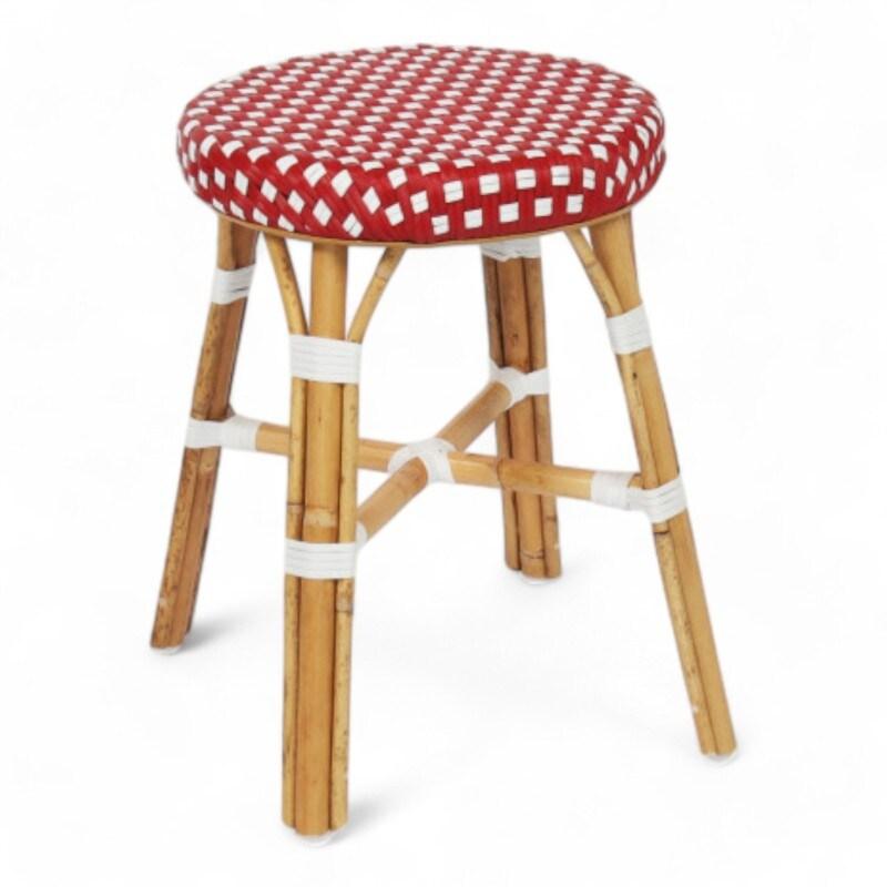 Le tabouret de terrasse parisienne en rotin. Ce tabouret de bistrot doit son style original à son tressage rouge et blanc et à sa structure en rotin. Il arbore un design estival et pop. Ce tabouret de terrasse de restaurant est empilable et léger, ce qui en fait un tabouret en rotin très pratique.. Nos tabourets extérieurs sont également prévus pour un usage particulier. Ils peuvent être utilisés comme tabourets de jardin ou de balcon.. . . Caractéristiques techniques. . Tabouret de terrasse rouge et blanc. Dimensions du tabouret : D 35 x H 45 cm. Structure entièrement en rotin. Tabouret empilable. Livré monté. Poids : 2 kg. . . . Comment bien entretenir son tabouret de terrasse en rotin ?. Les tabourets conçus en rotin ne doivent pas être exposées de façon prolongée à la pluie et à l'humidité. Durant la période hivernale, ceux-ci doivent être mis sous abris à chaque fin de journée ou stockées en intérieur. Le rotin est un matériau qui aura tendance à griser lorsqu'il est en contact prolongé avec de l'eau.