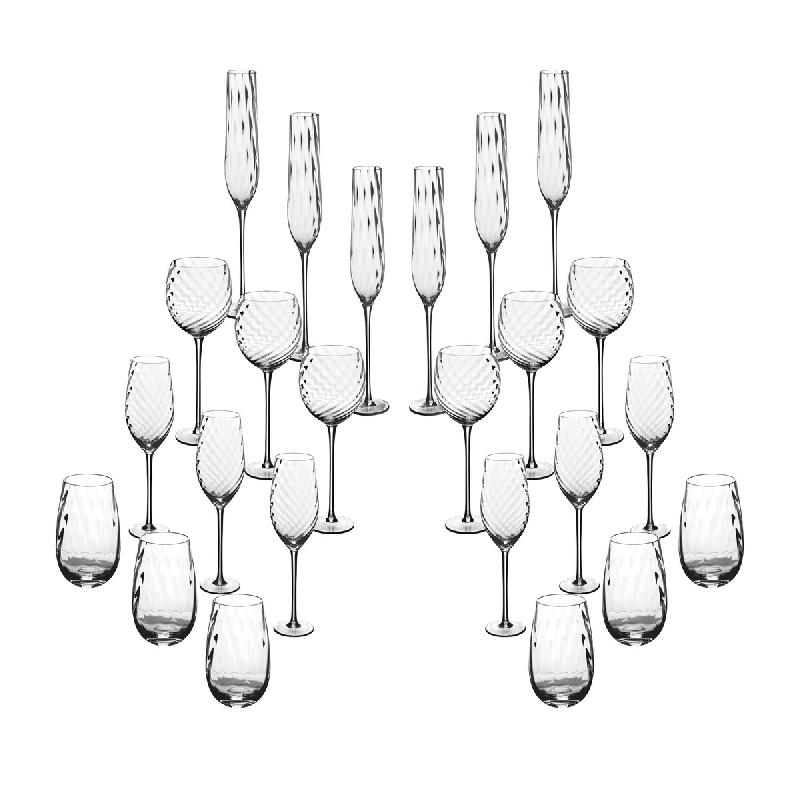 Ce set complet de 24 verres a été pensé pour répondre à tous les usages de la table, de l'apéritif au dessert. Il comprend six gobelets de 33 cl, parfaits pour l'eau, les jus ou les boissons du quotidien. Les six verres à pied de 36 cl accompagnent idéalement les vins blancs, rosés ou rouges légers, tandis que les six verres à pied de 60 cl sont conçus pour les cocktails généreux, les vins rouges puissants ou les boissons servies avec glace. Enfin, les six grandes flûtes de 26 cl subliment les vins pétillants. Avec leur texture raffinée et leur design sobre mais élégant, chaque verre apporte une touche de relief à table.