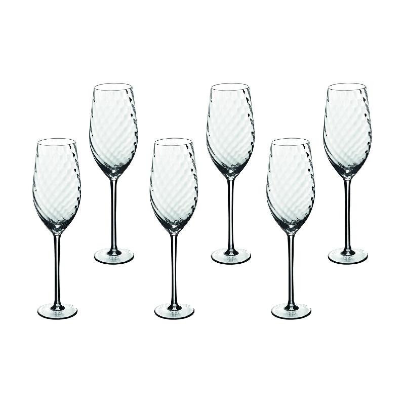 Fine et élancée, cette longue flûte de 26 cl et 29 cm de haut sublime l'effervescence des champagnes et des vins pétillants. Son motif spiralé discret accentue la verticalité du verre et joue subtilement avec les bulles et les reflets. Une pièce à la fois festive, épurée et incontestableme