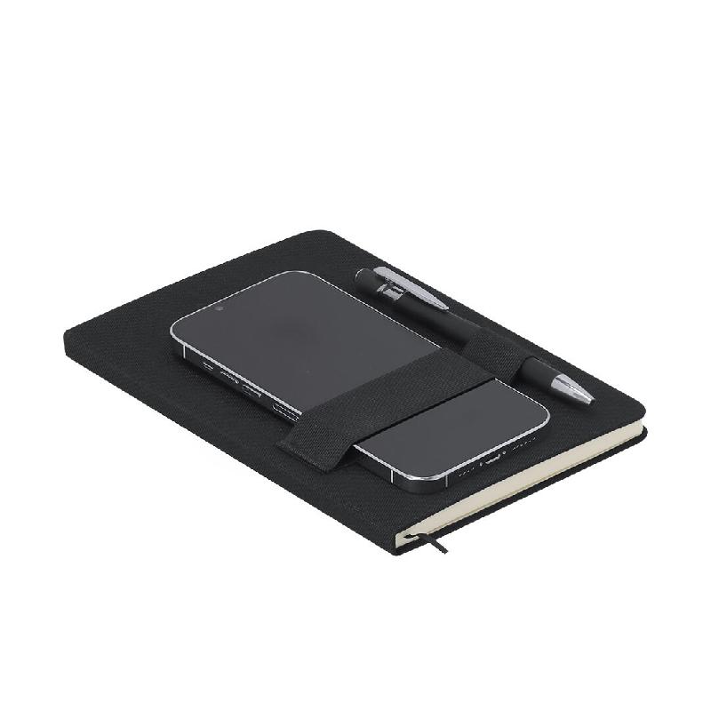 Élégant ensemble premium comprenant : Bloc - notes en RPET dans une élégante couleur noire. Inclut une fermeture élastique, une poche frontale et un marque - page en tissu. Intérieur avec 80 feuilles à disposition lignée. Stylo en RPET avec finition noire mate, mécanisme rotatif et encre bl