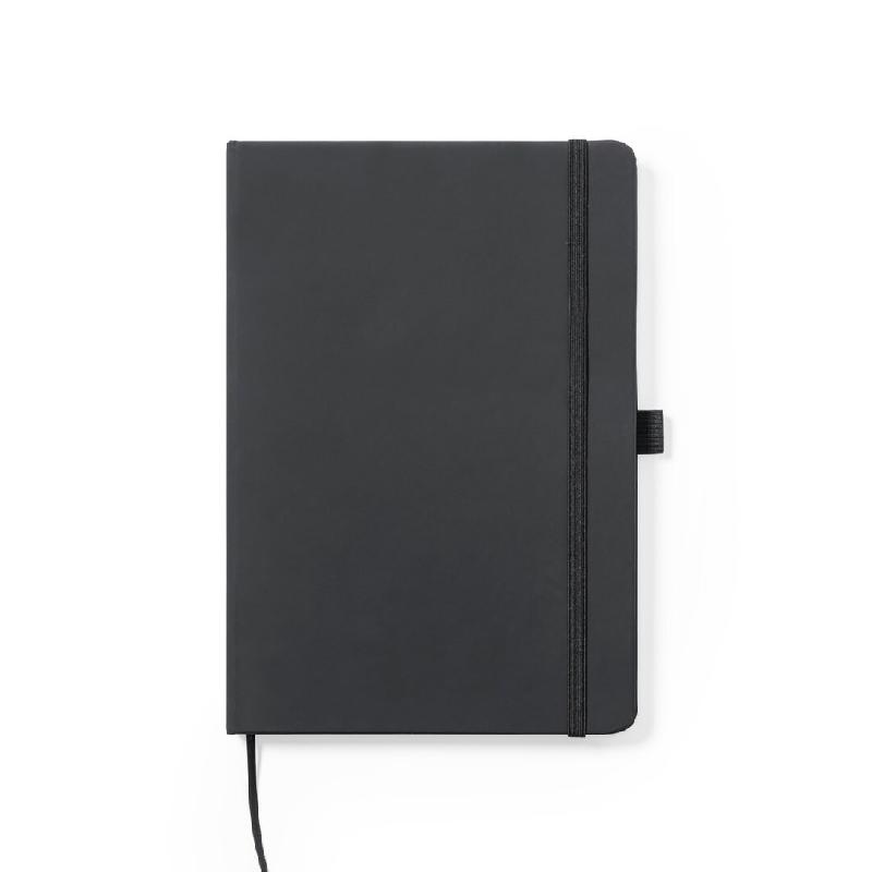 Bloc-notes fabriqué en similicuir avec une finition élégante en noir. Avec des couvertures rigides, un marque-page et un élastique de maintien assorti. Intérieur avec 100 feuilles lignées et support pour stylo (stylo non inclus). 14,7 x 21 x 1,5 cm | 290 g.