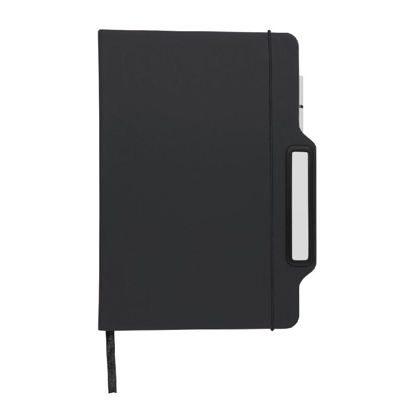 Bloc-notes en cuir PU doux. Avec des couvertures rigides, inclut un support pour smartphone sur la couverture. Comprend un stylo d'écriture éternelle de couleur blanche. Avec 80 pages lisses de couleur crème à l'intérieur, fermeture élastique noire et marque-page assorti. 15,8 x 21,5 x 1,7 cm | 280 g.