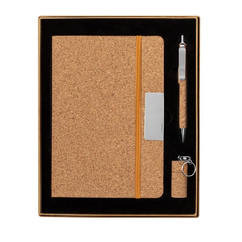Ensemble de bloc-notes et stylo à bille en liège. Comprend : Bloc-notes rigide avec détail métallique sur la couverture, marque-page en tissu et élastique assorti. 80 feuilles intérieures lignées. Stylo à bille avec corps recouvert de liège doux. Élégant clip métallique et accessoires assortis, mécanisme à bouton-poussoir et encre bleue. Porte-clés clé USB de 16 Go en forme de bouchon de bouteille. Ensemble présenté dans un élégant coffret design couleur kraft, avec compartiment indépendant pour chaque article. 26 x 3 x 21 cm | 480 g.