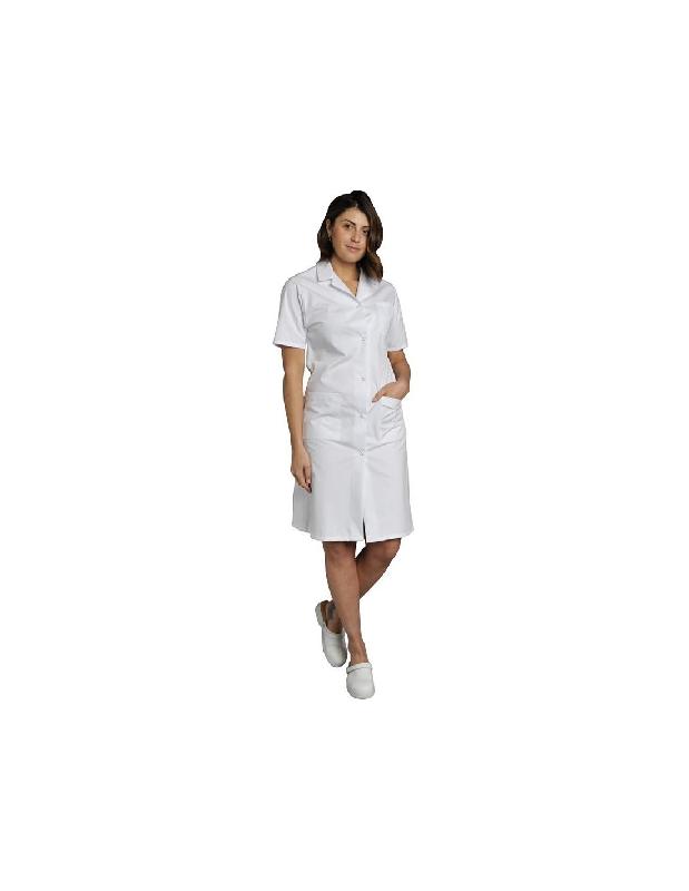 Blouse femmeCol tailleurManches courtes (existe sans manche ou avec manches longues en produits liés)Fermeture pressions1 poche poitrine et 2 poches basses Vidéo ici Matière écologique Matière : 100% cotonGrammage : 200 gr Tailles : 0 à 6Longueur dos : 1050 mmColoris : blancSur demande : perso