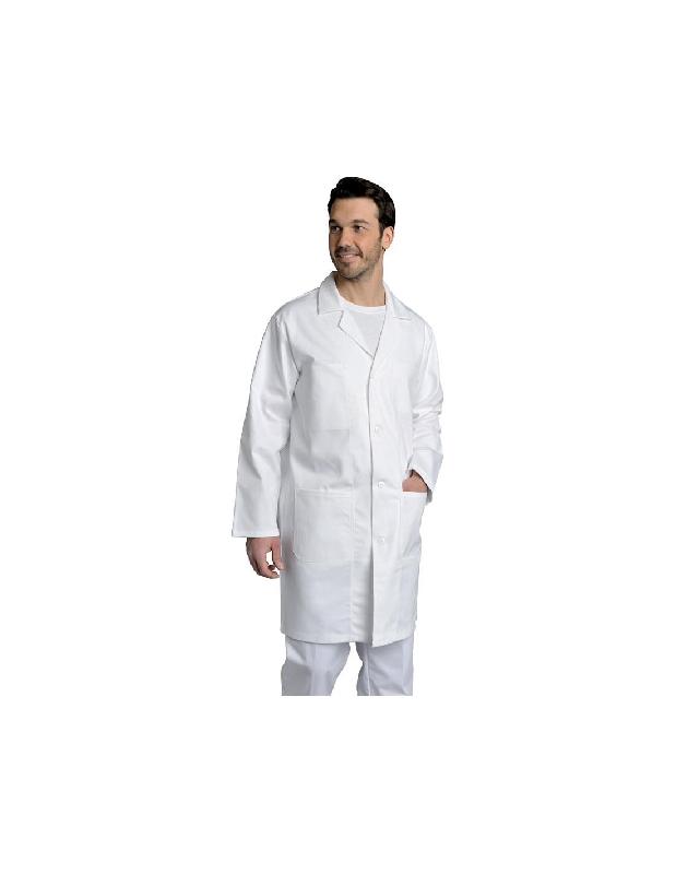 Blouse hommeCol tailleurManches longuesFermeture 4 boutons1 poche intérieure1 poche poitrine et 2 poches basses Vidéo ici Matière écologique Matière : 100% sergé cotonGrammage : 240 gr Tailles : 0 à 6Longueur dos : 1000 mmColoris : blanc, bleu bugattiSur demande : personnalisation Vendue à l