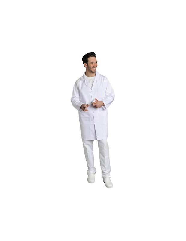 Blouse hommeCol tailleurManches longuesFermeture 4 pressions1 poche intérieure1 poche poitrine et 2 poches basses Vidéo ici Matière : 65% polyester 35% cotonGrammage : 240 gr Tailles : 0 à 7Longueur dos : 1000 mmColoris : blanc, bleu bugatti, noir, marron, orange, vert bouteille, money grey, rou