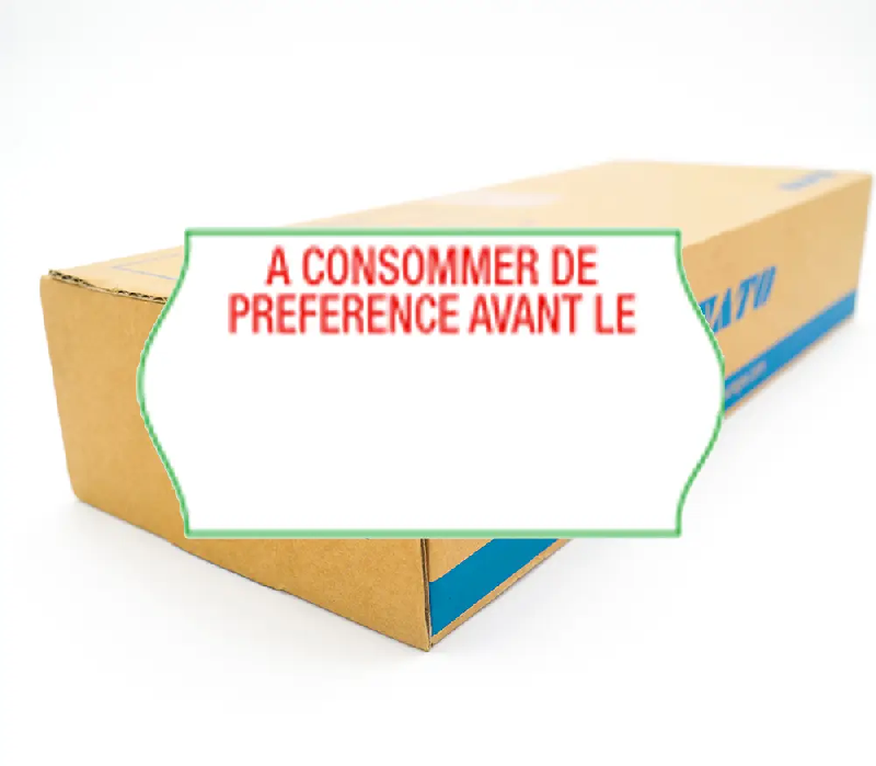 Boîte de 75 000 étiquettes 18mm x 16mm blanches adhésif permanent - Caractéristiques : - Dimensions : 18mm x 16mm - Adhésif : permanent - Couleur : blanche avec impression rouge "A CONSOMMER DE PREFERENCE AVANT LE" - Utilisation : - Convient lorsque la DLC (Date Limite de Consommation) du