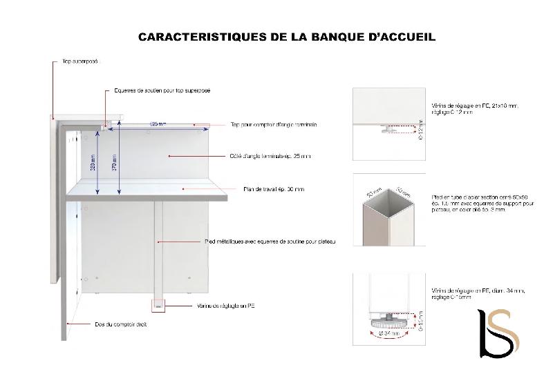 Dimensions globales : L286/306 x P112,5 x H113 cm - Plateau principal - Dimensions : 140x80 ou 160x80 cm - Hauteur : 73 cm - Épaisseur : 2,5 cm - Chant ABS droit 2 mm - Comptoir bas (accès PMR) - Largeur : 140 cm - Profondeur : 82,5 cm - Hauteur : 73 cm - Caractéristique annexes - Mati