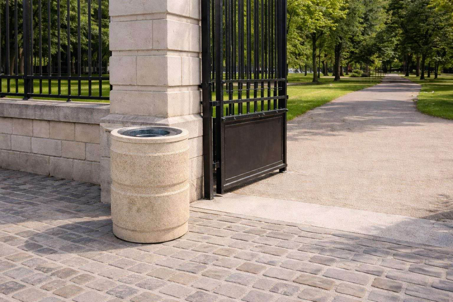 Corbeille de propreté en béton pour l'aménagement extérieur de vos collectivités. - Corbeille en béton garantie 10 ans. - Descriptif de la corbeille de propreté Kaola : - Porte de service en acier galvanisé avec fixation du sac - Fermeture par 2 clés triangle - Accessoire : - Couvercl