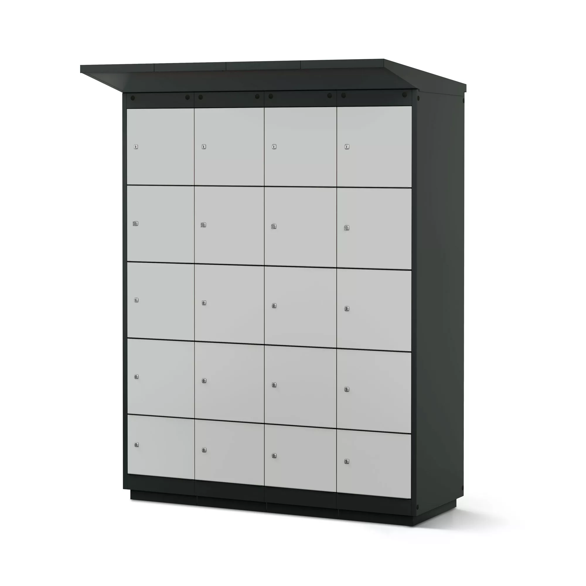 Son corps robuste en tôle d’acier traité anti-humidité et résistant aux intempéries est revêtu d’une peinture cuite au four résistante aux UV. Les portes à double paroi, parfaitement ajustées grâce à une fermeture magnétique, protègent efficacement le contenu contre la poussière et l’humidité. Pour un confort d’utilisation, les compartiments supérieurs ont des prises légèrement abaissées, et chaque colonne intègre tout en bas un compartiment de service verrouillable.