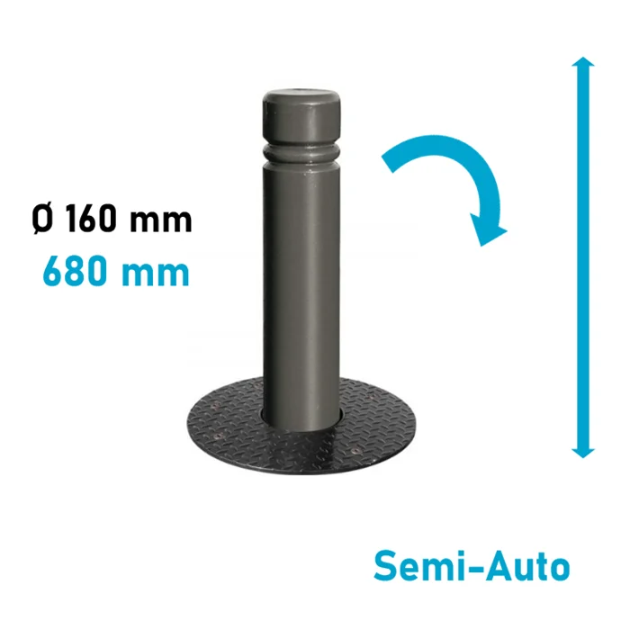 Borne escamotable manuelle - Hauteur 70 cm - Diamètre 14 cm - Caractéristiques standards : - • Cylindre : - • En acier traité par métallisation zinc et poudre époxy Ø 14 cm - hauteur 70 cm - • Teinte RAL 7016 - • Joint brosse évitant les rayures sur le fût - • Bande réflÃ