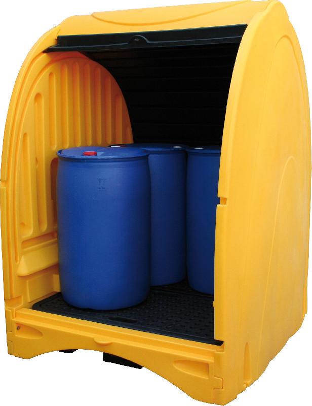 Box de stockage PE pour 4 fûts - volume 485 l - finition 100% polyéthylène - fermeture rideau coulissant