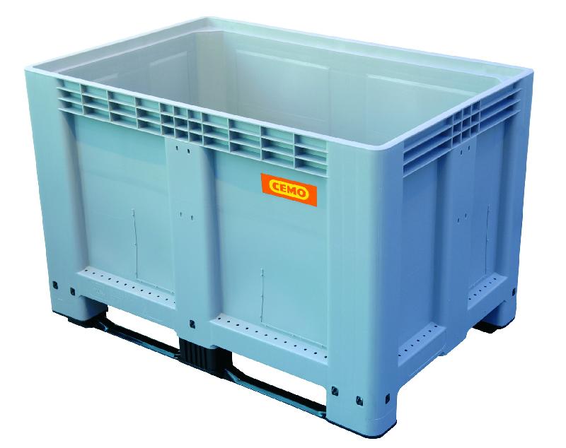 BOX LOGISTIQUE d'une capacité de 525 litres livré sans couvercle. Pour le stockage et le transport de vrac : Box étanche en polyéthylène (possibilité de percer des trous de vidange). Résistant à l'acide sulfurique des batteries. Passage de fourches bilatéral avec 2 patins. Charge maxi : 350