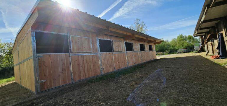 2 Boxes en ligne PRO pour Chevaux - Espace sécurisé et confortable - Offrez à vos chevaux un espace de vie confortable et sécurisé avec nos 2 boxes en ligne PRO, conçus en bois Douglas et poteaux métalliques, alliant solidité et durabilité. Parfait pour les écuries modernes, ce système