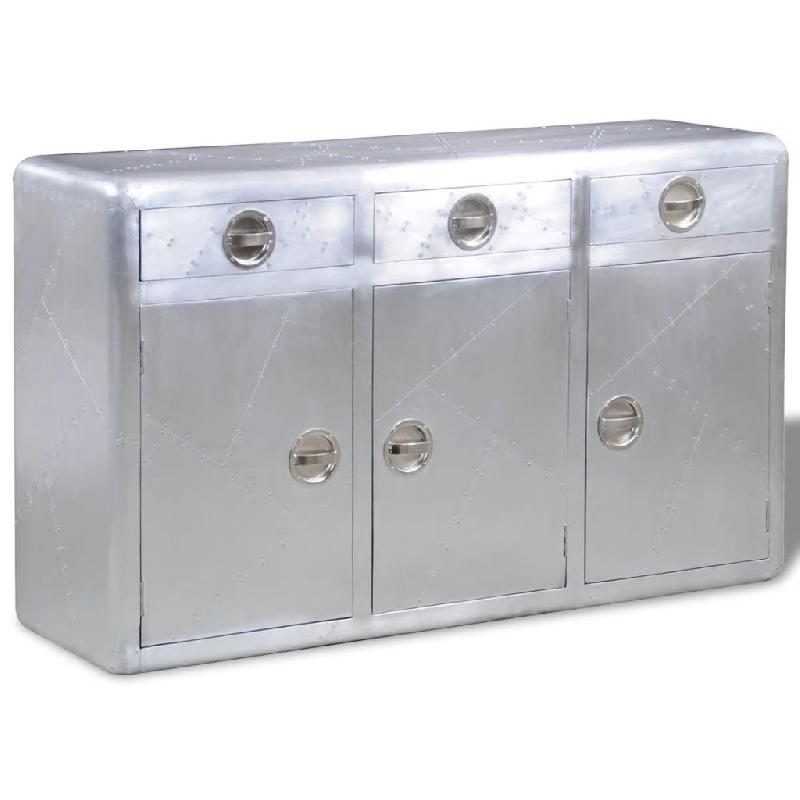 Ce buffet aviateur est fabriqué en bois massif, avec une surface revêtue de panneaux en aluminium poli, accentués par des vis en acier exposées, ce qui le rend extrêmement durable. La bordure lisse et les poignées de tiroir rétro lui confèrent un look unique.