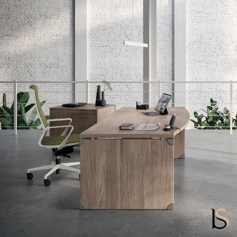 bureau intemporel haut de gamme - pieds panneaux dans la forme generale du bureau - formes arrondies et adoucies - nombreuses coordinations couleurs et nature plateaux et pietement - ensemble a materiaux nobles