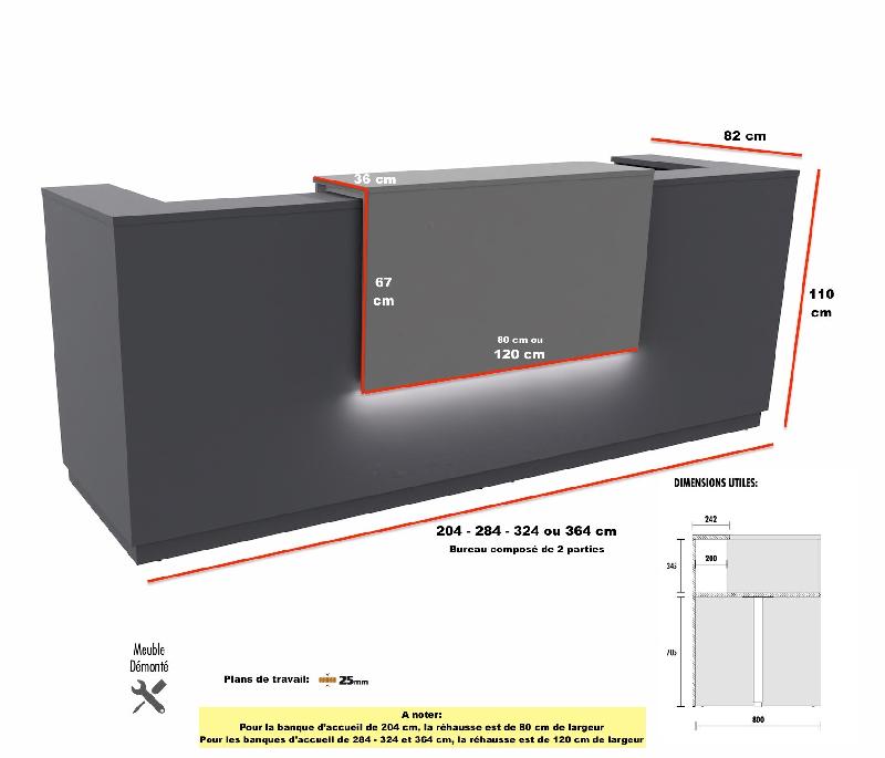 Dimensions globales : L230 / 250 / 270 / 290 x P160 x H117.5 cm - Plateau principal - Largeur : 120, 140, 160 ou 180 cm - Profondeur : 80 cm - Hauteur : 75 cm - Épaisseur : 2,5 cm - Plateau de liaison - Largeur : 80 cm - Profondeur : 80 cm - Épaisseur : 2,5 cm - Comptoir Attention Person