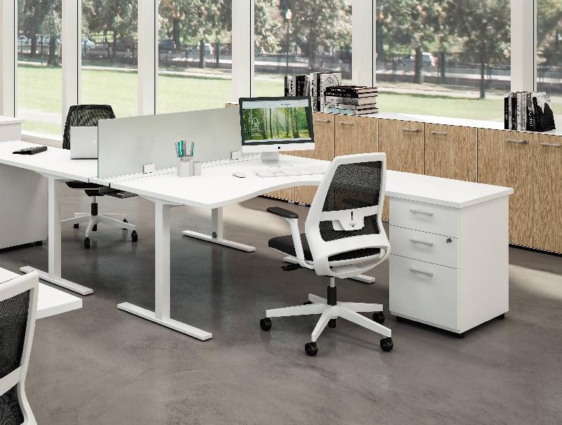 Ce poste de travail est équipé d'un retour avec caisson à 3 tiroirs, dont un pour les dossiers suspendus, une version 4 tiroirs classiques est également disponible, nous consulter.