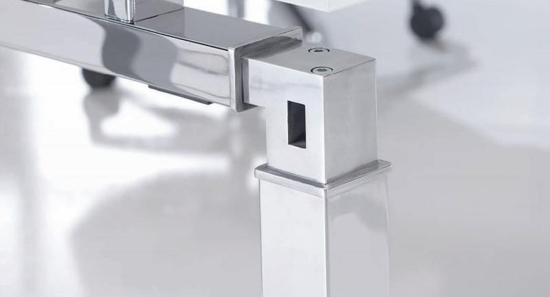 Le piètement en arche de finition chromée donnera un look très sympa, il est équipé de vérins de réglage et de stabilité pour corriger les éventuels défauts du sol.
