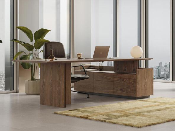 Bureau de direction Ono sur crédence. Conception et esthétique : Bureau de direction haut de gamme avec une finition en placage bois noble, des lignes tendues et équilibrées. - Marque : Frezza
