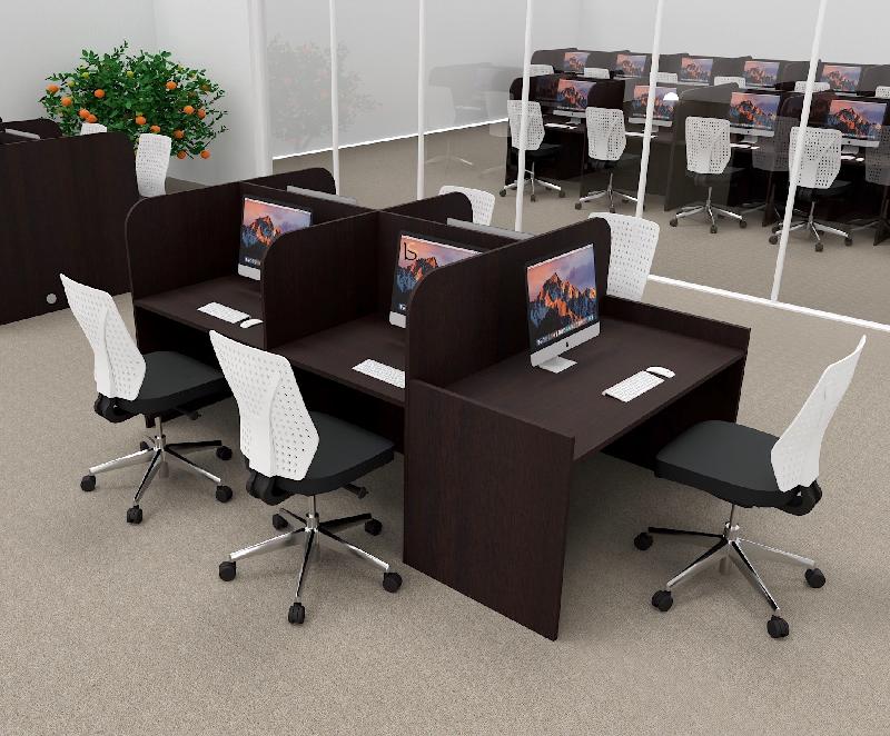 Nous vous proposons ici une version mixte de 4 postes de 100 cm de largeur et d'un bureau intégré de 140 cm pour superviseur.