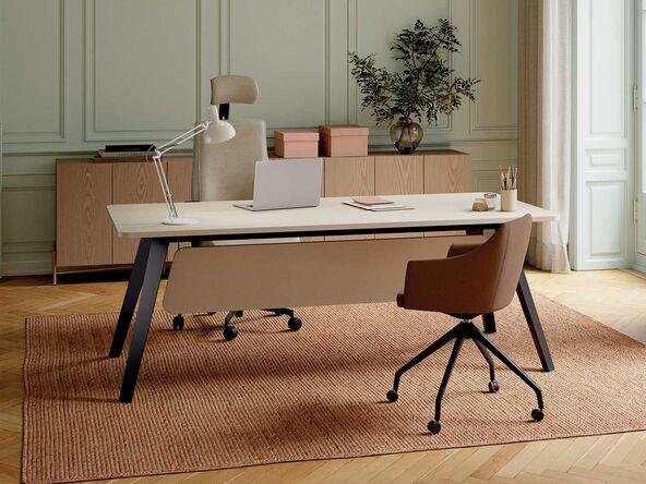Bureau de direction Knot par DVO. Plateau mélaminé 25 mm d'épaisseur. Largeurs 140 cm, 160 cm, 180 cm et 200 cm. Profondeurs 65 cm, 80 cm et 100 cm. Structure acier hauteur 74 cm. Personnalisable. - Marque : DVO