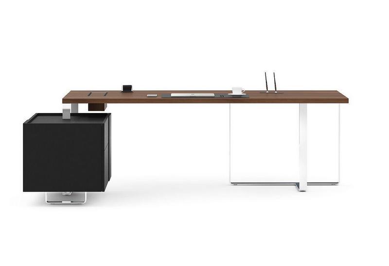 Le bureau de direction avec caisson ULYSSE compose un jeu d'éléments verticaux et horizontaux. Ce bureau représente la concrétisation d'une sculpture industrialisée. Il est prolongé par une allonge aux formes monolithiques qui combine un design émotionnel à une fonctionnalité correcte. L