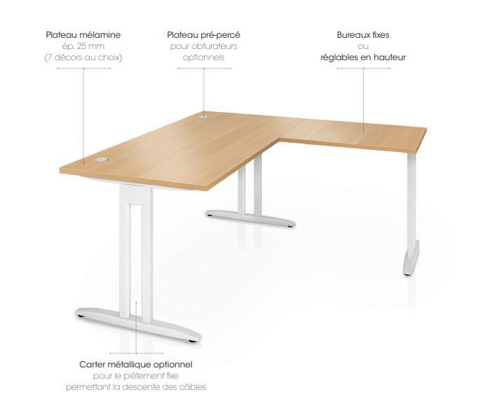 - Plateau : Profondeur 80 cm - Longueur 180 cm - Caractéristiques : Les plateaux ne sont pas pré - percés pour obturateurs - Pieds : Piétement fixe avec carters - Pieds décentrés - Traverse : Incluse - Prix : 330 € HT + 2,59 € -