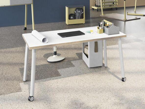 Le bureau Nomade de Clen (fabrication française) est conçu pour le flex office avec un montage/démontage rapide par pieds emboîtés et molettes (sans outillage complexe). Plateau ép. 30 mm.