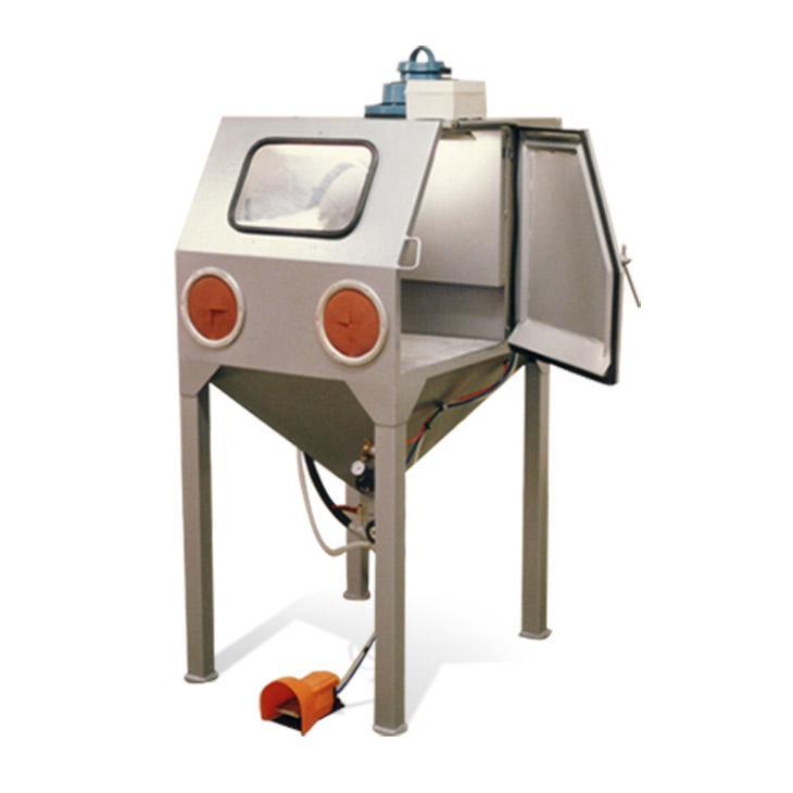 Cabine de sablage à manche avec dépoussiéreur intégré - Grille - support de travail : Monobloc, charge maxi 100 kg - Porte - pistolet : Réglable, monté sur la paroi gauche - Interrupteur de sablage : Pédale pneumatique au pied - Porte de la cabine : Porte type vantail monobloc, dégondab