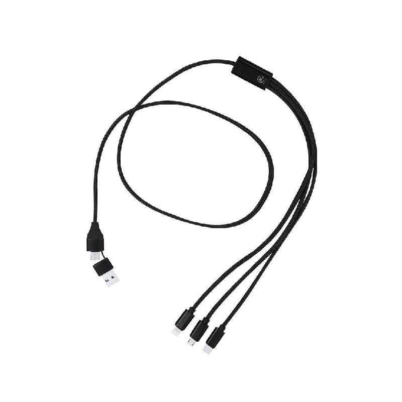 Câble de charge en aluminium recyclé. Avec double connexion d'entrée Type-C/USB et sorties Type-C, Lightning et Micro USB. L'aluminium recyclé est un matériau aux possibilités de recyclage presque infinies, sans perdre ses propriétés d'origine et consommant moins d'énergie dans ce processus. Certification GRS (Global Recycled Standard), qui garantit l'origine recyclée du matériau utilisé pour produire le produit. Connexion Micro USB, Type-C et Lightning 5V DC 2.4A.